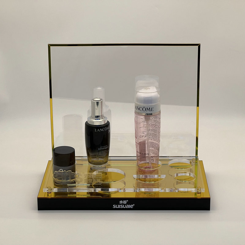The back panel, likewise in crystal-clear acrylic, is elegantly framed with a fragile gold trim, linking the whole design together. This backplate serves numerous functions: it provides a clean, clean history, secures the products, and uses a prime canvas for branding or promotional messaging.